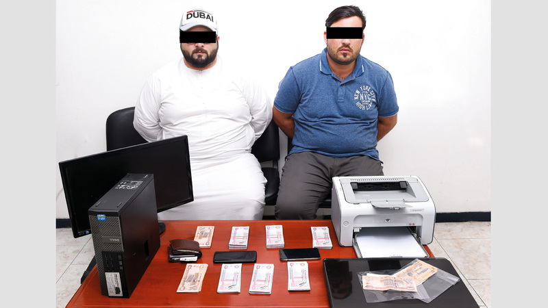 متهمان من العصابة وأمامهما بعض العملات المزيفة. من المصدر