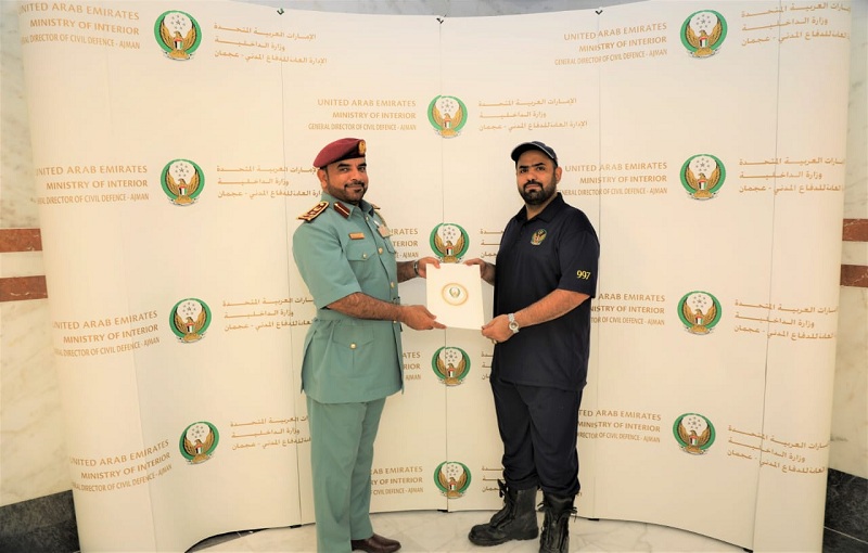 وكرمت الإدارة العامة للدفاع المدني لعجمان، الإطفائي زايد الظفري بحضور نائب المدير العام العميد راشد جاسم مجلاد، على شجاعته وسرعة استجابته وتعامله مع الحادث مما أسفر عن إنقاذ الأسرة من الحريق.