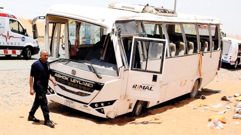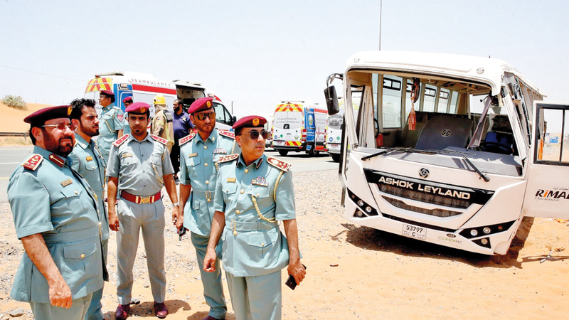 وأوضح أن الحافلة كانت تقل 32 شخصاً، إضافة إلى السائق، لافتاً إلى أن الحوادث التي تكون الحافلات أو الشاحنات طرفاً فيها تؤدي إلى أضرار جسيمة، ووقوع إصابات بليغة تصل إلى حد الوفاة، مشيراً إلى أنه يجب على جميع السائقين ضرورة الانتباه جيداً للطريق، وعدم الانشغال بغيره، والتأكد من صلاحية الإطارات للاستخدام، خصوصاً خلال فترة الصيف، وضرورة صيانة المركبات والالتزام بالتعليمات والتوجيهات، واتباع القواعد المرورية المعمول بها على مستوى الدولة، لجعل الطرق أكثر أمناً وسلامة، عبر تحمل المسؤولية وقيادة مركباتهم بصورة آمنة.
