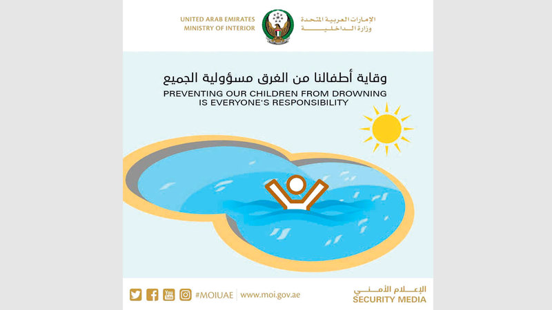 وحذّرت وزارة الداخلية، من أن الإهمال يعد سبباً رئيساً وراء وقوع حوادث غرق الأطفال، التي تحدث في دقائق قليلة، مشددة على ضرورة الالتزام بإرشادات السلامة، وتوفير منقذين على أحواض السباحة، للحد من هذه الحوادث.