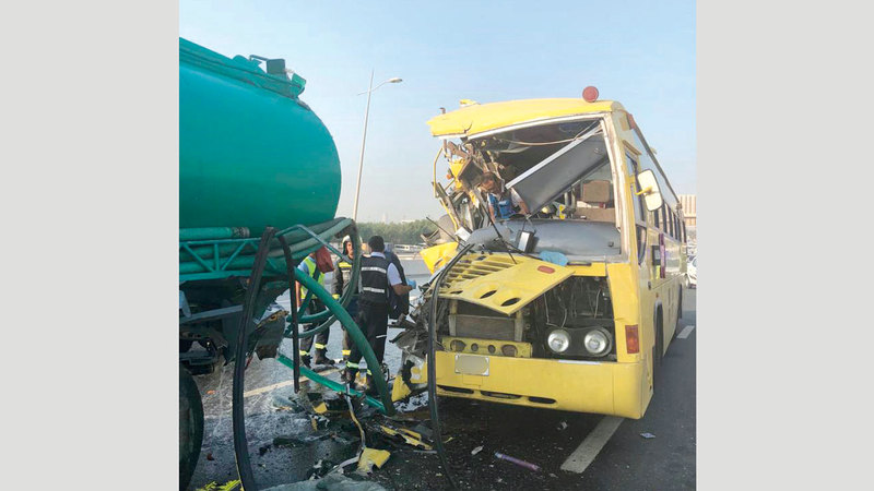 وكشفت المعاينة الأولية من قبل خبراء حوادث السير في شرطة دبي، أن سبب الحادث عدم ترك سائق الحافلة مسافة كافية مع الصهريج أمامه، ما أسفر عن إصابة 19 شخصاً، بينهم 15 طالباً ومشرفتان، أصيبوا بإصابات بسيطة، ومشرفة ثالثة وسائق الصهريج تعرضوا لإصابات متوسطة، وتم نقل 17 حالة إلى مستشفى راشد، فيما خضعت حالتان للعلاج في موقع الحادث.