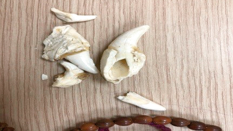 مواد شعوذة تتضمن جلود حيوانات وصورها وقصاصات ورقية وخواتم وعلب تمائم وإبراً. من المصدر
