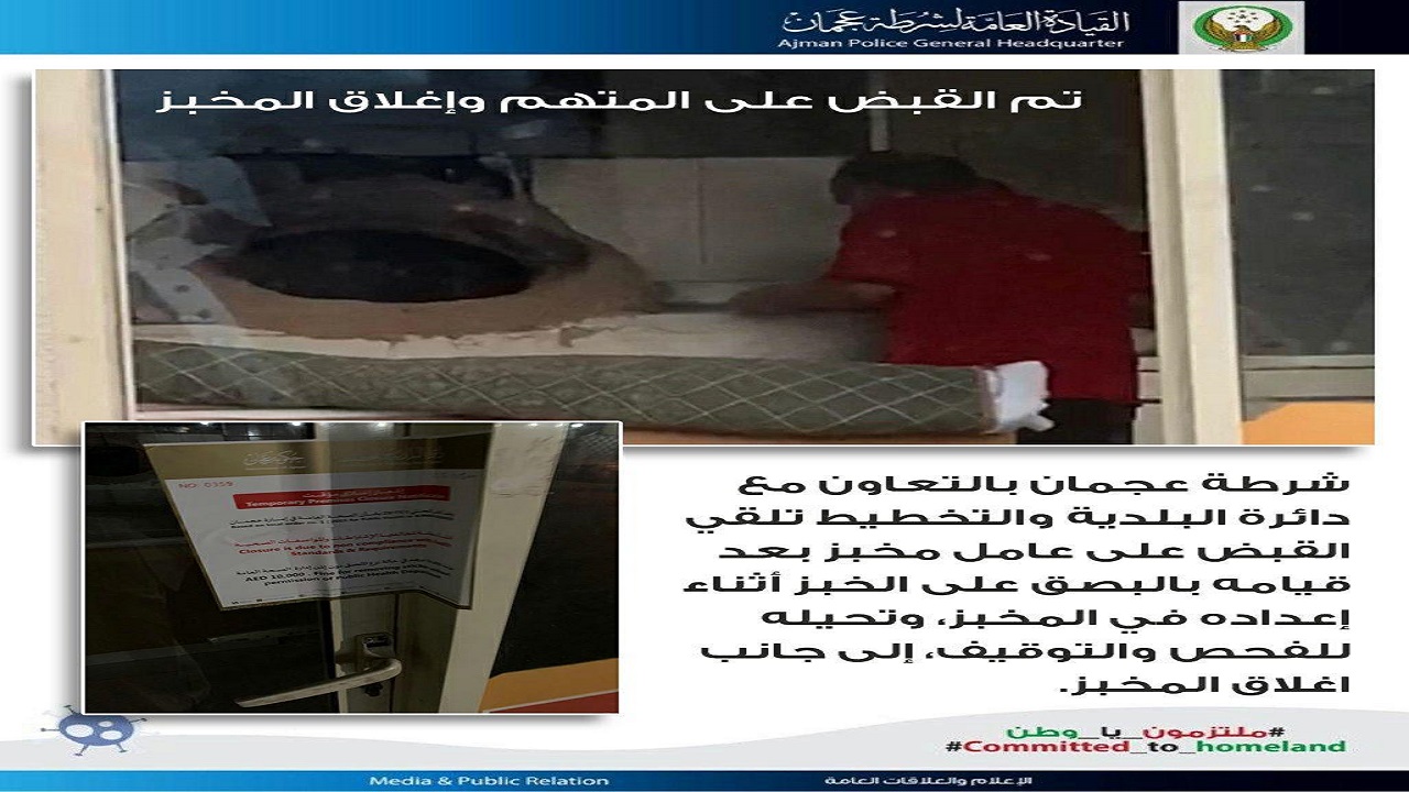 ألقت القيادة العامة لشرطة عجمان القبض على عامل آسيوي تعمد البصق على عجين الخبز أثناء إعداده في مخبز بإمارة عجمان، وذلك بالتعاون مع دائرة البلدية والتخطيط بعجمان.