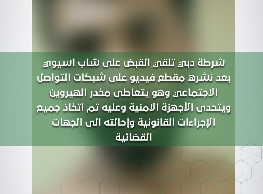 ألقت الإدارة العامة لمكافحة المخدرات بشرطة دبي القبض على شاب آسيوي بعد نشره مقطع فيديو على شبكات وسائل التواصل الاجتماعي وهو يتعاطى مخدر الهيروين، ويتحدى الأجهزة الأمنية، وعليه تم اتخاذ جميع الإجراءات القانونية وإحالته الى الجهات القضائية، وذلك كما ذكرت شرطة دبي عبر حسابها الرسمي بموقع "تويتر".
