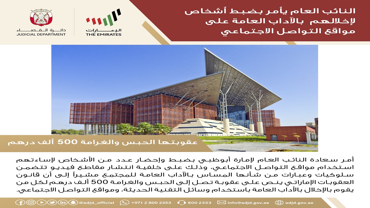النائب العام لإمارة أبوظبي يأمر بضبط أشخاص لإخلالهم بالآداب العامة على مواقع التواصل الاجتماعي