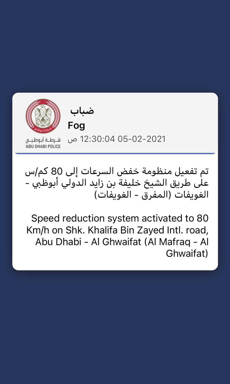 وأفاد مدير مركز التواصل الاجتماعي في إدارة الإعلام الأمني، الرائد خليفة عبد الله العبيدلي، بأن 90% من جمهور المتابعين لحسابات شرطة أبوظبي أكدوا استفادتهم من التنبيهات التي تبثها شرطة أبوظبي لإشعار السائقين بخفض السرعات القصوى على بعض الطرق أثناء حالت تشكل وتراكم الضباب.