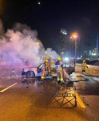 3 إصابات وحريق بسبب تصادم مركبتين في دبي