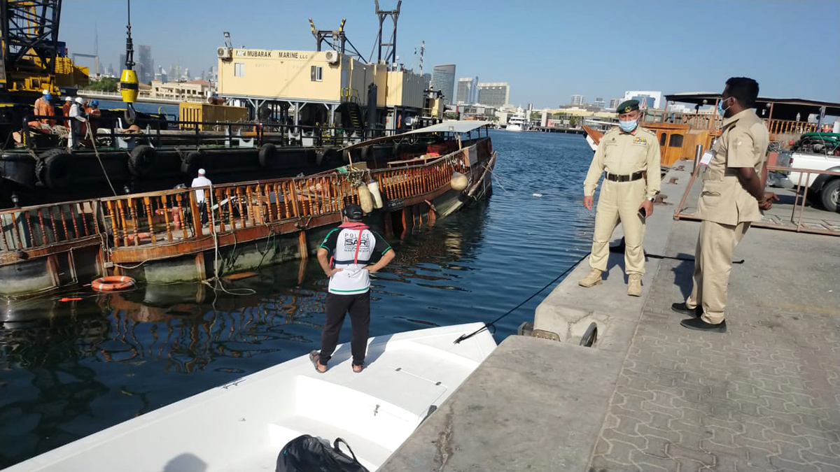 • زورقا إنقاذ بكامل معداتهما انتقلا إلى رصيف خور دبي لانتشال المركب المائل.