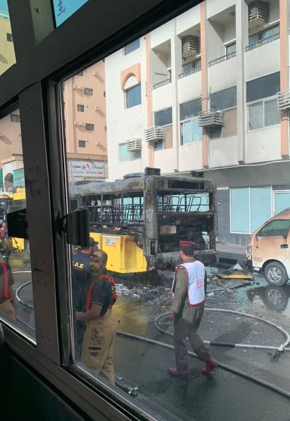 تمكن سائق حافلة مدرسية من إخلاء طلبة في الوقت المناسب بمساعدة المارة إثر اندلاع النيران في الحافلة المدرسية بشكل مفاجئ واحتراقها بشكل كامل على شارع الخان في إمارة الشارقة أثناء عودة الطلبة إلى منازلهم.