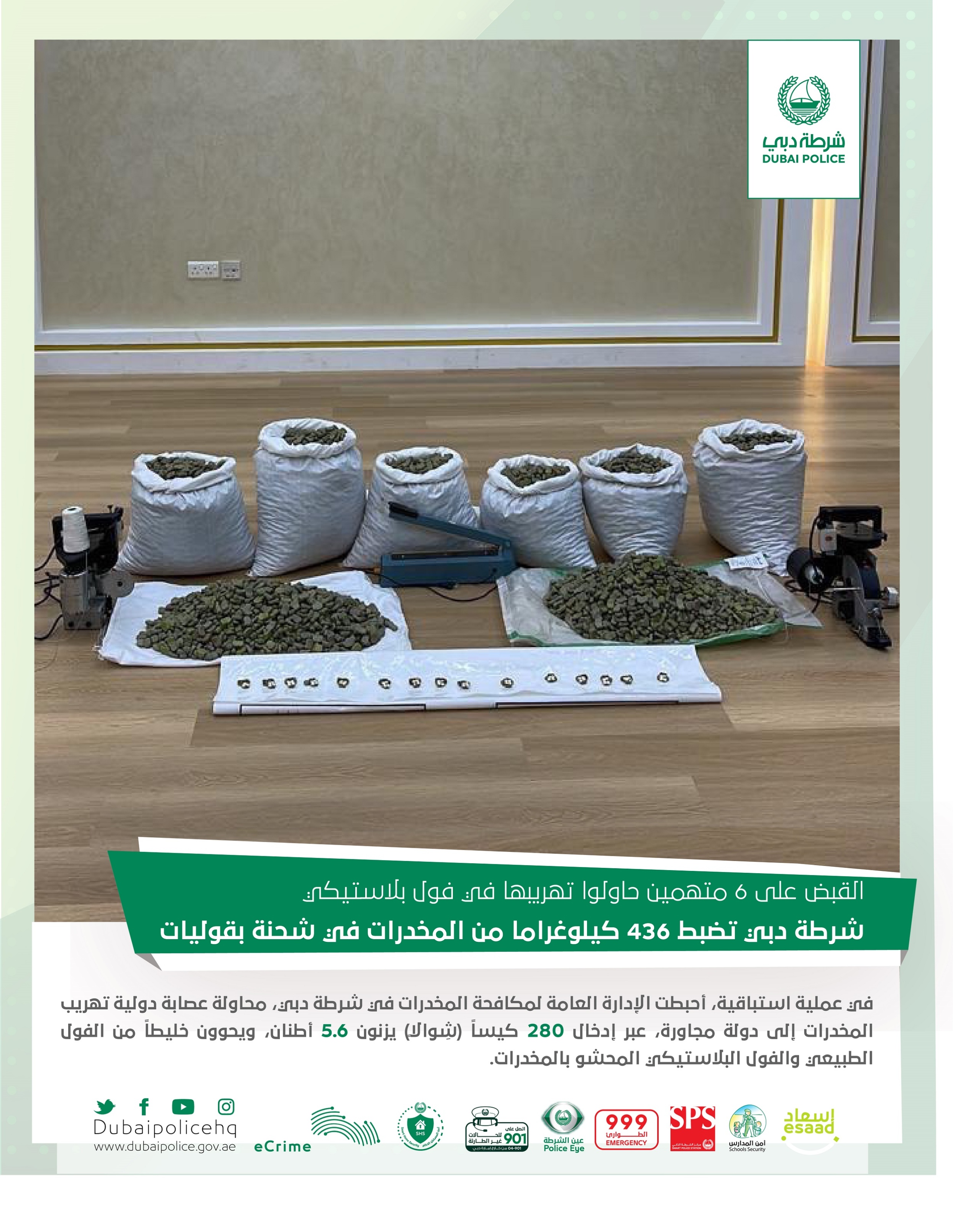 وقال شرطة دبي في بيان لها إن فرق البحث والتحري بالإدارة العامة لمكافحة المخدرات وقفوا بالمرصاد لأعضاء العصابة، وداهموا مستودع التخزين وألقوا القبض على 6 متهمين، واستخرجوا "السموم" من حبات الفول البلاستيكي بكمية تزن 436 كيلوغراماً من المخدرات، في زمن قياسي يقدر بـ 7 ساعات عمل متواصلة.