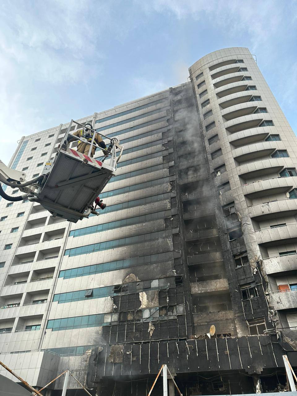 نقل سكان البناية المحترقة في عجمان إلى مقر الإيواء