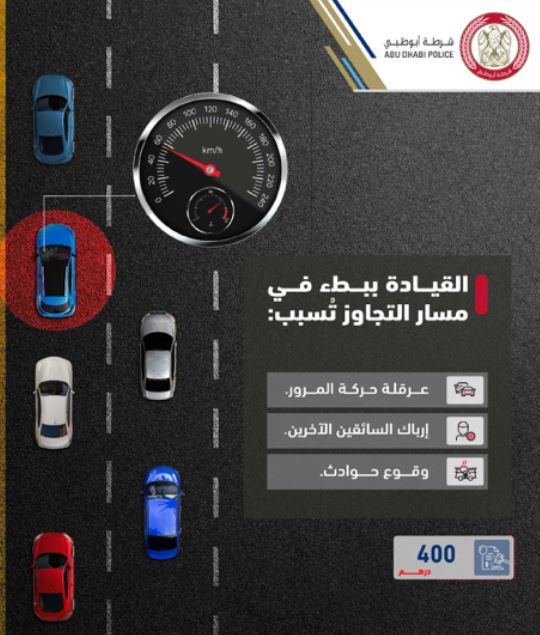 دعت شرطة أبوظبي السائقين إلى الالتزام بالمسار الأيمن عند القيادة بسرعات بطيئة لما تسببه من عرقلة في حركة السير وإرباك السائقين ووقوع حوادث أليمة ، موضحة أن مخالفة عدم إفساح الطريق للمركبات التي لها أفضلية القادمة من الخلف أو من جهة اليسار "مسار التجاوز " قيمتها 400 درهم.