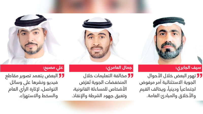 واستهجن مواطنون ومقيمون تصرفات الباحثين عن الشهرة و«الترندات» خلال فترة الحالة الجوية غير المسبوقة التي شهدتها الدولة الأسبوع الماضي، إذ اعتبروا أن تلك التصرفات سلبية وتسيء إلى صورة الدولة، كما أنها تعيق جهود رجال الشرطة والأجهزة المعنية بتسيير حركة السير والمرور في مثل هذه الظروف، وتقديم الخدمات والمساعدات للعالقين، مطالبين بتشديد العقوبات على مرتكبي مثل تلك التصرفات التي وصفوها بـ«غير المسؤولة».