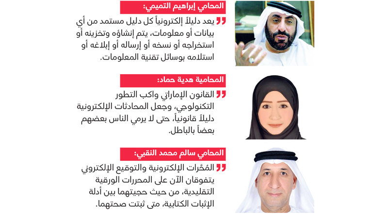 وأكد المحامي إبراهيم التميمي أن هناك من الأدلة الإلكترونية ما يأخذ حجية الأوراق الرسمية، ومنها ما يأخذ حجية الأوراق العرفية في ما يتعلق بما صار يعرف بـ«الديون الشفهية»، أو إقراض الأموال بشكل ودي بين شخصين أو بين أطراف عدة، مشيراً إلى أن المرسوم بقانون اتحادي رقم (35) لسنة 2022 في شأن الإثبات في المعاملات المدنية والتجارية، قد خصص الباب الرابع منه للتحدث عن الإثبات بالدليل الإلكتروني، وتناول ذلك في ست مواد، هي المواد من 53 إلى 59.