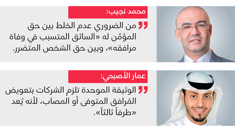 وفي السياق ذاته، قال المستشار القانوني في شركة «ميثاق للتأمين» الدكتور عمار علي الأصبحي، إن الوثيقة الموحدة تلزم الشركات بتعويض المرافق المتوفى أو المصاب، لأنه يُعد «طرفاً ثالثاً» ما لم يكن موظفاً لدى مالك المركبة أو من أفراد أسرته المقيمين معه، وأضاف أنه «بعد دفع التعويض، للشركات حق الرجوع على المؤمن له في حالات عدة، وهي إذا ثبت أن عقد التأمين بُني على بيانات غير صحيحة (مثل العمر أو إخفاء معلومات جوهرية)، وإذا ثبت استخدام المركبة بشكل غير مشروع، وكان ذلك سبباً مباشراً للحادث، مثل الحمولة الزائدة».
