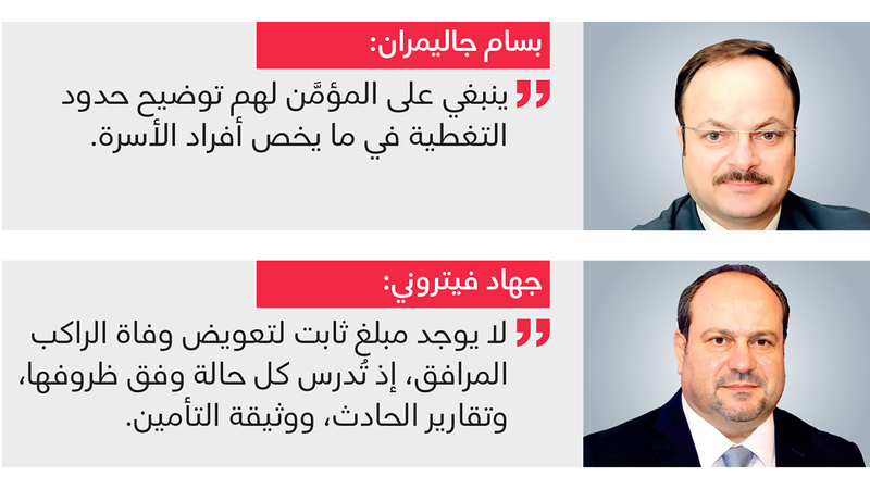 من جهته، شرح الخبير التأميني جهاد فيتروني، جانباً مهماً من مسائل التعويض، موضحاً أنه «لا يوجد مبلغ ثابت لتعويض وفاة الراكب المرافق، إذ تدرس كل حالة وفق ظروفها، وتقارير الحادث، ووثيقة التأمين، ورأي الخبراء، وهناك قضايا حكمت فيها المحاكم بمبالغ كبيرة جداً، خصوصاً إذا ترتب على الحادث عجز دائم أو أضرار طبية باهظة»، وقال فيتروني إن «التقييم القانوني الدقيق للضرر هو ما يحكم قيمة التعويض، وليس مجرد رقم ثابت منصوص عليه في القانون، وهناك قضايا حكم فيها بتعويضات كبيرة للغاية بالنظر إلى عدد الضحايا والخسائر التي نتجت عنها».
