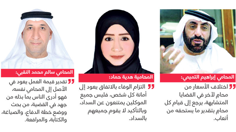 ودعا متقاضون وأصحاب أعمال إلى وضع آلية لتحديد أتعاب المحامين في القضايا المختلفة، وفق جدول تقريبي يراعي ظروف المتقاضين وخبرات وحقوق المحامين، ووصفوا أتعاب مكاتب المحاماة في الإمارات بـ«المبالغ فيها»، وأنها تمثل عبئاً إضافياً على المتقاضين، مشيرين إلى أن أتعاب بعض القضايا، تفوق ما يحصل عليه المتقاضي من تعويض أو ورث.