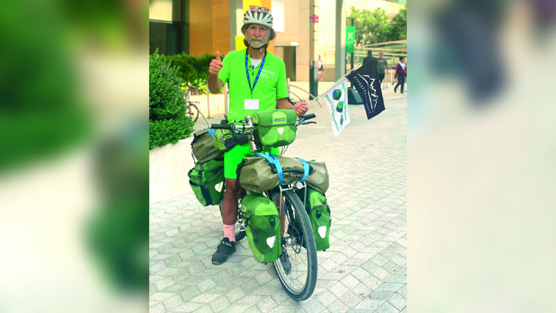 بزيه الأخضر.. وعلى متن درّاجة هوائية، وصل الرحّالة الألماني مايكل إيفرتس، إلى دبي من برلين، بعد مسيرة طويلة استغرقت أكثر من سبعة أشهر، مؤكداً أن حرصه على حضور فعاليات مؤتمر المناخ «كوب 28»، الذي تستضيفه دولة الإمارات له أهداف سامية، إذ يسعى إلى نقل تطلعات وآمال محبي الطبيعة و«كوكبنا العظيم» إلى المشاركين في المؤتمر العالمي.