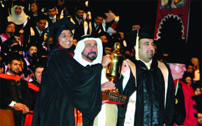 أكد صاحب السمو الشيخ الدكتور سلطان بن محمد القاسمي عضو المجلس الأعلى حاكم الشارقة رئيس الجامعة الأميركية في الشارقة، أن الجامعة خطت خلال السنة الدراسية الماضية خطوات واضحة نحو التوسع وتطبيق خطط واستراتيجيات التنمية. جاء ذلك في حفل تخريج 461 طالباً وطالبة من خريجي دفعة الفصل الثاني لعام 2010 في الجامعة الأميركية في الشارقة، الذي عُقد في قاعة المدينة الجامعية صباح أمس. وأضاف سموه أن مشاركة الأساتذة والطلبة في المؤتمرات والندوات والفعاليات المحلية والإقليمية والدولية المتخصصة والفوز بجوائزها زادت، كما ارتفعت المشاركة في التواصل والاحتكاك مع مختلف القطاعات الإنتاجية في المجتمع لتبادل الخبرات والاستشارات، وعقد عدد من المؤتمرات المهمة.