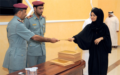 شهد وكيل وزارة الداخلية المساعد للجنسية والإقامة والمنافذ، اللواء ناصر العوضي المنهالي، تخريج 18 من طالبات كليات التقنية العليا اللاتي أكملن تدريبهن العملي في شؤون الجنسية والاقامة والمنافذ في معهد الإمارات للجنسية والإقامة بمقره في أبوظبي. وهنأ المنهالي الطالبات على تحقيقهن مستويات متميزة في التدريب، ثم وزع الشهادات على الخريجات. كما تفقد سير العمل في المعهد، واطلع على قاعات الدراسة والتدريب والمستجدات التدريبية ووجه المسؤولين فيه بضرورة الاهتمام بالمكتبة الخاصة بالمعهد، وتوفير الكتب والمراجع اللازمة وجمع وتنظيم البحوث المتخصصة التي أعدها ضباط الجنسية والاقامة والمنافذ، والاستفادة من نتائجها في تطوير العمل.