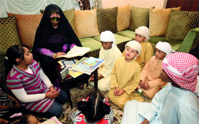 والمفارقة أنها كل مساء تجمع أحفادها الـ،26 وتقيم لهم ما يشبه الحجرة المدرسية في منزلها، وتشرح لهم ما درسته، وتعيد عليهم ما حفظته من آيات القرآن الكريم، وهم يرددون خلفها، وأحياناً يصححون لها معلومة درسوها في المدرسة.
