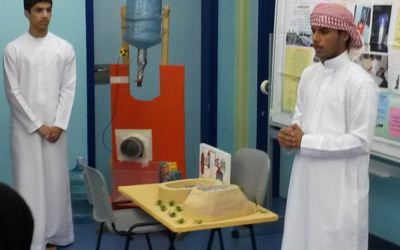 وقدم طالبان في مدرسة الراعفة للتعليم الاساسي والثانوي، عبدالله سعيد بن حمضه، وعلي ضيف الله، بحثاً عن كيفية استخدام مياه الخليج في توليد الطاقة الكهربائية، وتعتمد فكرة الجهاز على معادلة الاستمرارية، أي أن معدل تدفق الماء يعتمد على المساحة والسرعة لاستعماله في توليد الكهرباء، والجهاز يتميز بقلة تكلفته التي تقل كثيراً عن محطات إنتاج الكهرباء عبر الوسائل المعروفة، مثل المحطات النووية والبترولية المكلفة مالياً، وغير الصديقة للبيئة، ويهدف المشروع إلى إنتاج طاقة كهربية اقتصادية، نظيفة، وإنتاج طاقة من البيئة المحيطة، وتقليل استهلاك الكهرباء في محطات تحلية المياه. ويهدف المؤتمر الثامن للكيمياء والجيولوجيا، إلى تشجيع روح البحث العلمي والاستقصاء لدى الطالب، والحث على دور التعلم التعاوني في إنجاح المشروعات العلمية.