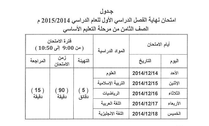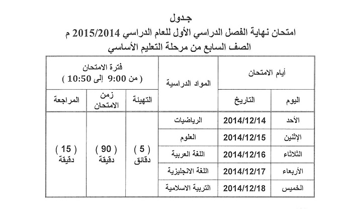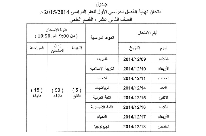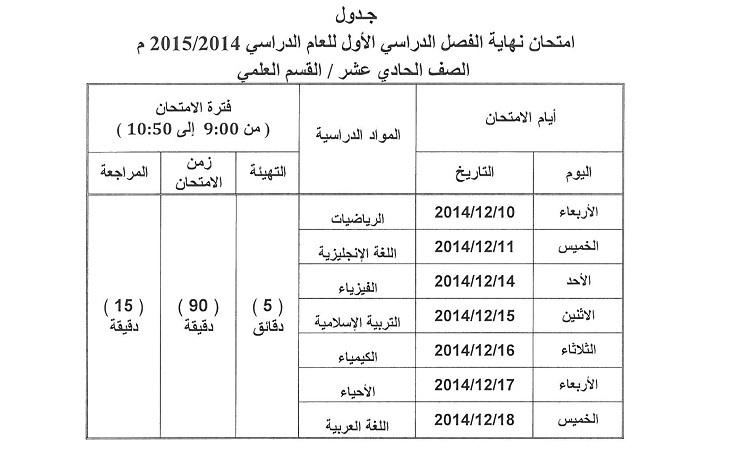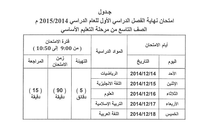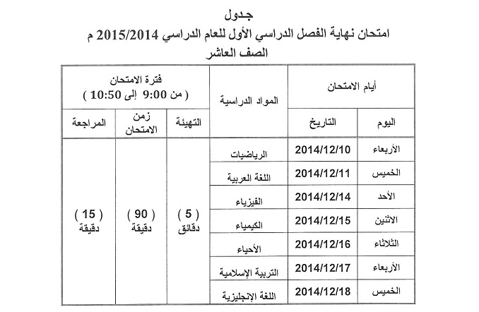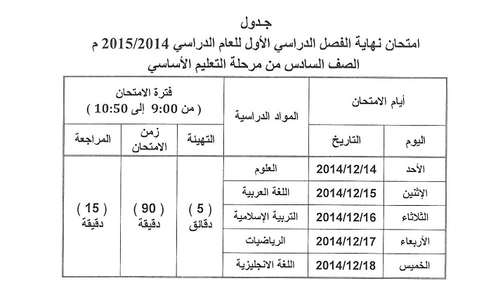 اعتمدت وزارة التربية والتعليم يوم الخميس الماضي جداول امتحانات الفصل الدراسي الأول للصفوف من السادس إلى الثاني عشر.