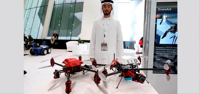 ابتكر الباحث المساعد في معهد الروبوت في جامعة خليفة، مصعب الحمادي، طائرة بدون طيار، لتوصيل المساعدات الأولية والإسعافات والأقنعة وسترات واقية في أماكن الكوارث والحرائق وفي حالات الغرق، كما شارك في تصميم طائرة أخرى بدون طيار تقوم بعمل مسح ثلاثي الأبعاد للمكان، ويمكن التحكم فيها من خلال الهواتف الذكية.