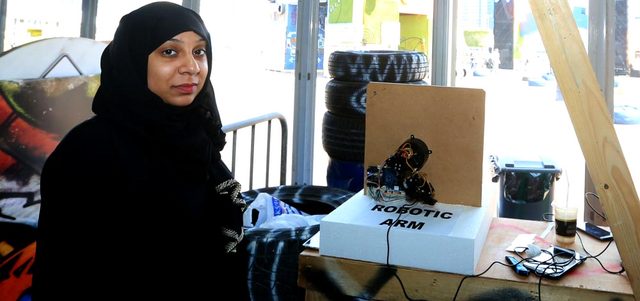 الطالبة حسنة السالمي تشرح مكونات الذراع الآلية واستخداماتها. تصوير: نجيب محمد
