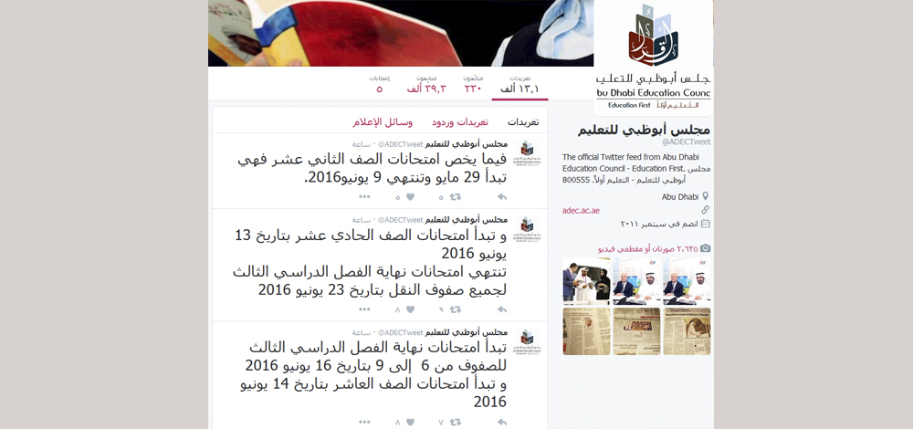 ذكر مجلس أبوظبي للتعليم في تغريدة على حسابه في موقع التواصل الاجتماعي "تويتر" أن امتحانات نهاية الفصل الدراسي الثالث للصفوف من 6 إلى 9 ستبدأ بتاريخ 16 يونيو 2016".
