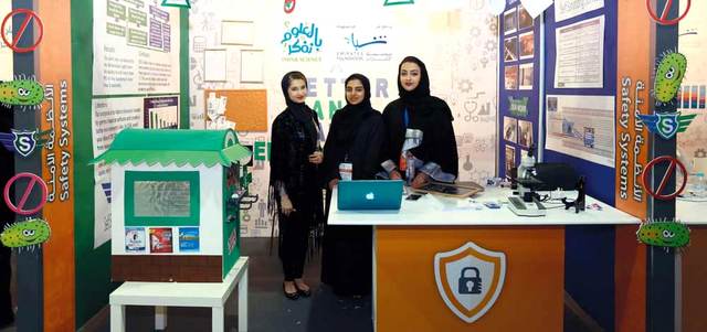 من اليمين شمة التميمي وشوق الطواشي ورانا عبادي خلال عرض ابتكارهن في «بالعلوم نفكر». من المصدر