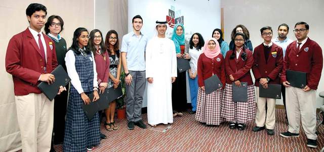 الظاهري يتوسط الطلبة المتفوقين في اختبارات كامبريدج خلال تكريمهم. من المصدر