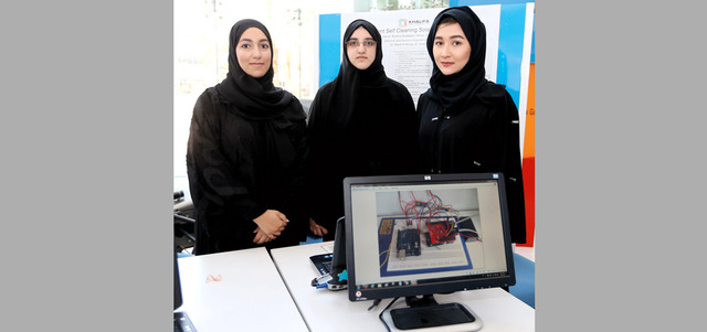 الطالبات خلال عرض مشروعهن في أسبوع ابتكارات الطلبة بجامعة خليفة. تصوير: نجيب محمد