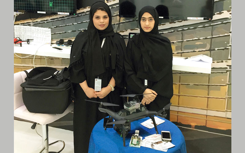 (من اليمين) نورة الخضيري ومناير الحمادي خلال عرضهما الابتكار في «آيدكس». الإمارات اليوم