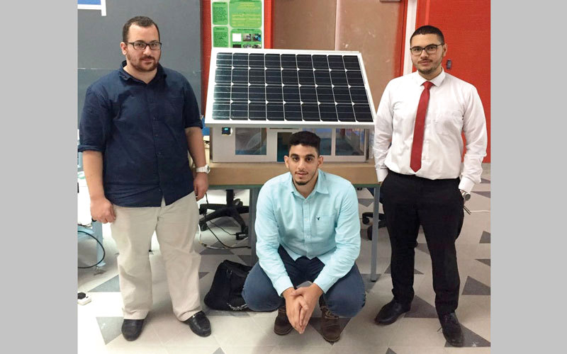 (من اليمين) الطلاب محمود السيد وعمرو الطيبي وأمين جابر، مع نموذج المنزل الذكي. من المصدر