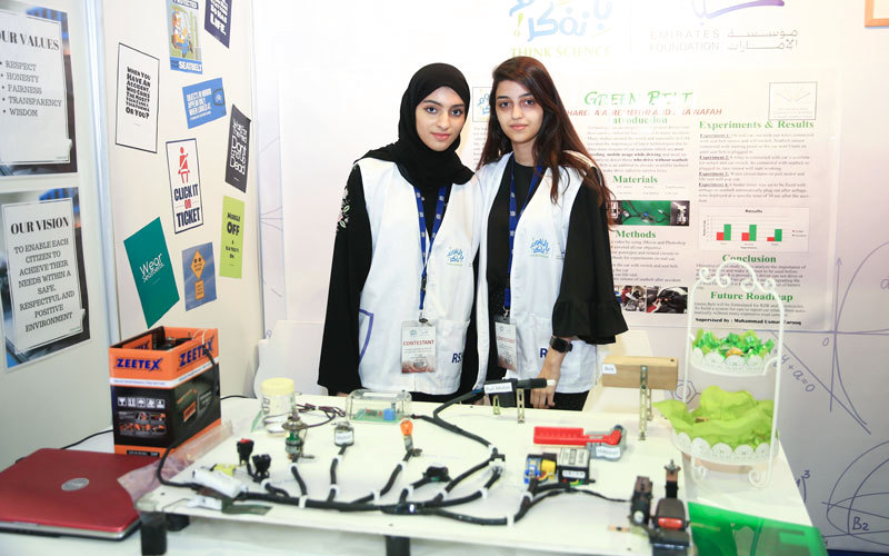 وعن المشروع الثالث (الحزام الأخضر)، قالت الطالبتان في مدرسة «إنترناشونال كومينتي سكول» بأبوظبي، إنه نظام للأمن والسلامة في المركبات، وهو يوفر أكبر قدر من الأمان لسائقي السيارات، إذ يربط قدرتهم على قيادة السيارة بالتزامهم بربط حزام الأمان.