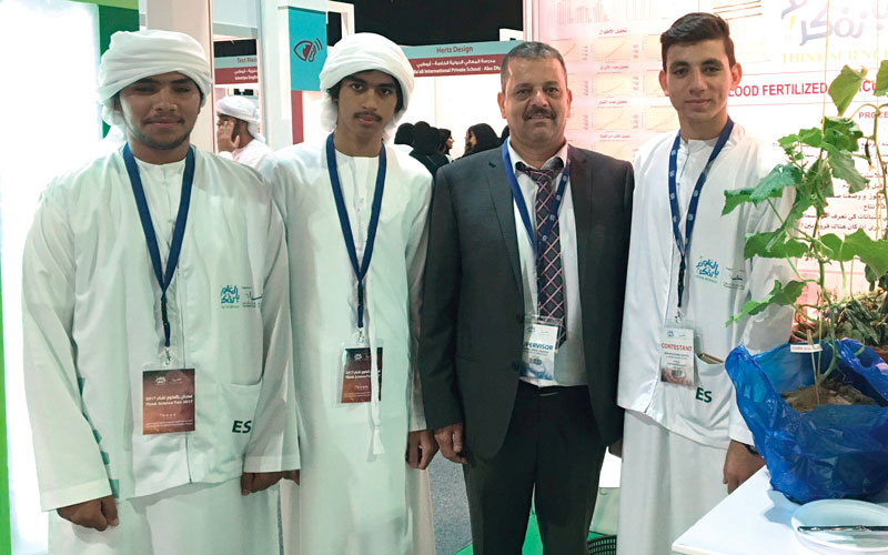 عبدالله المعيني وإبراهيم محمد دحدل وسيف المنصوري يتوسطهم المشرف براء شديد خلال تقديم المشروع. الإمارات اليوم