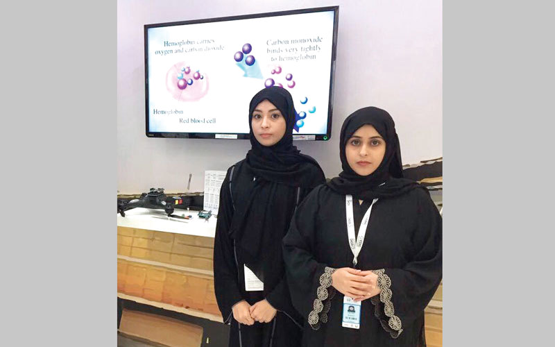 (من اليمين) أروى ومريم خلال عرضهما الابتكار. الإمارات اليوم