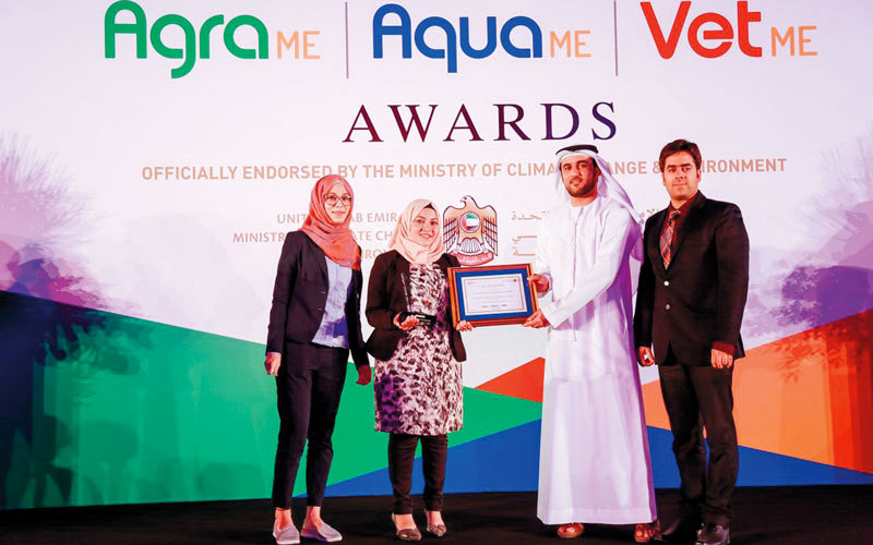 أعضاء من فريق البحث أثناء حصولهم على الجائزة في «أغرا ميدل إيست». من المصدر