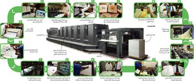 -- تتسلم المطابع الكتاب المدرسي على أقراص مدمجة، من وزارة التربية والتعليم، وتتأكد من وضوح المعلومات والتصاميم داخلها، والتدقيق عليها من الناحية الفنية. -- تطبع ثلاث نسخ «ديجيتال» مطابقة بنسبة 100٪ للأسطوانة الخاصة بكل كتاب تجربة أولى، يتم إرسالها إلى إدارة المناهج لاعتمادها من ناحية المواصفات والنواحي الفنية، وإحداث أية تعديلات تحتاجها وتالياً إعادتها مرة أخرى إلى المطبعة. -- التأكد من مطابقة الألوان والنصوص لأصل الكتاب الموجود في الأسطوانة المدمجة، وفق تقنيات متطورة. -- طباعة الكتاب على صفائح معدنية، لإرسالها في ما بعد إلى ماكينة الطباعة. -- يوضع الورق في الماكينة حسب الكمية المطلوبة طباعتها، وتبدأ عملية الطباعة على صفحات ورقية كبيرة من الجهتين. -- الصفحات الورقية الكبيرة، تذهب إلى ماكينة خاصة لطيها، وتحويلها إلى ملازم مستقلة، يتم تدبيسها كل على حدة، ليسهل جمعها في النهاية. -- توضع الملازم على آلات خاصة، تجمعها في كتاب واحد. -- تجليد الكتاب، من خلال ماكينات خاصة بذلك تضع المادة اللاصقة، والجلد المخصص للكتاب. -- قطع الزيادات الورقية الموجودة على الجوانب. -- تعبئة الكتب في صناديق ورقية خاصة، بشكل منظم، وتغلق جيداً. -- شحن صناديق الكتب وإرسالها إلى المدارس، ليتسلمها الطلاب بداية العام الدراسي. |