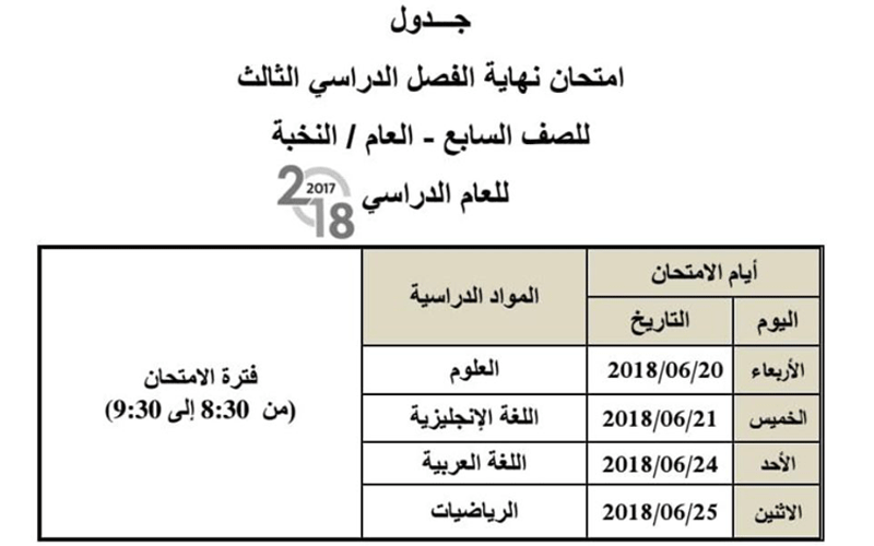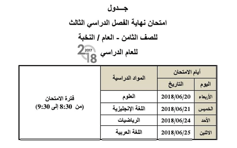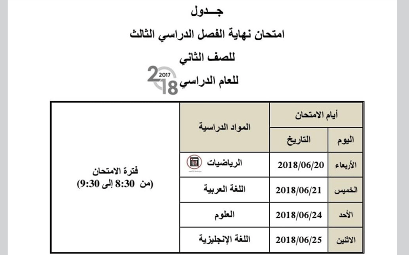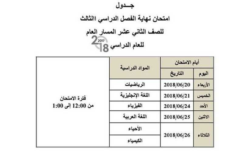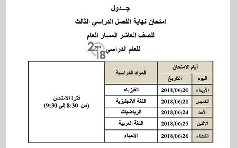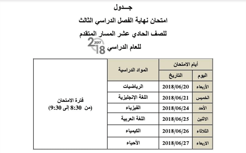 وتبدأ الامتحانات لجميع الصفوف في الـ 20 من الشهر الجاري، وتنتهي في الـ 26 من الشهر ذاته للصفوف الـ 10 والـ 11 والـ 12 للمسار العام، وأما لطلبة الـ 12 المسار المتقدم ستنتهي 27 من الشهر ذاته، وأما اختبارات الصفوف من الأول حتى الـ 9 للمسار التخصصي فستقام في 25 من الشهر ذاته، وأما مسار النخبة للصف الـ 9 ستنتهي امتحاناتهم في 27 الشهر الجاري.