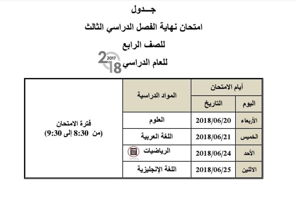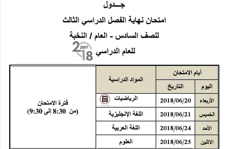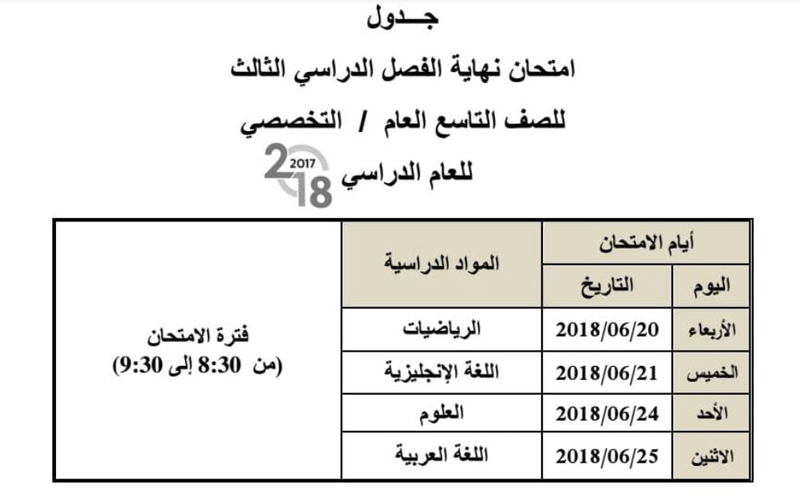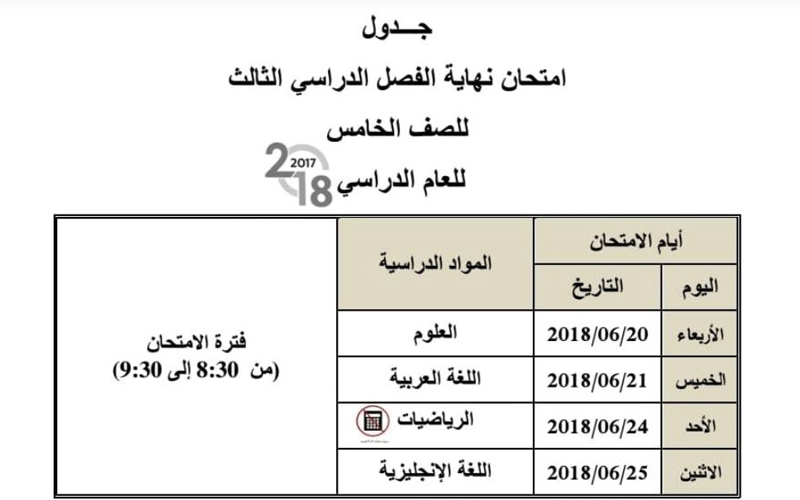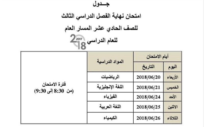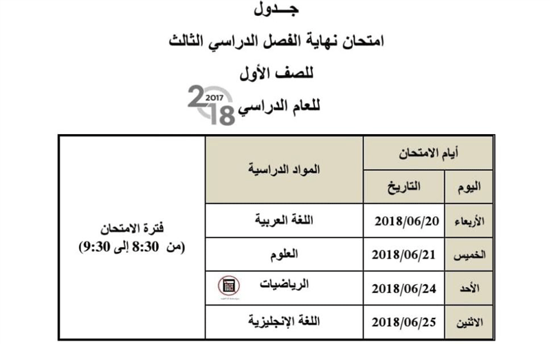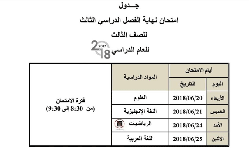 وأوضح جدول الامتحانات أدالذي اعتمدتها الوزارة أن زمن بدء الامتحانات للصفوف من الاول حتى الـ 11 عند الساعة الـ 8:30 صباحاً وحتى الـ 9:30 صباحاً، وأما امتحانات الـ 12 فستبدأ عند الساعة الـ 12 ظهراً وحتى الـ 1 بعد الظهر.