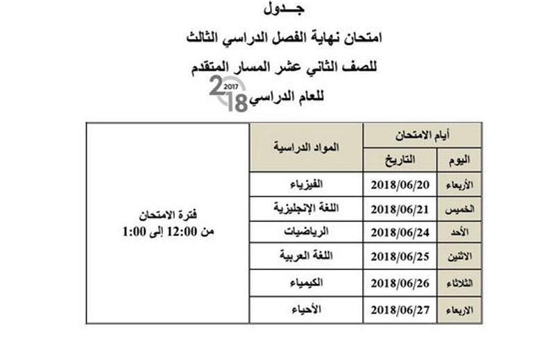 ويؤدي طلبة الصف الـ 12 المسار المتقدم امتحاناتهم بمادة الفيزياء فيما يختتمون الامتحانات في الـ 27 من الشهر الجاري بمادة الأحياء، فيما يبدأ طلبة المسار العام امتحاناتهم بامتحان مادة الرياضيات ويختتمون الامتحانات بامتحان مادة الكيمياء في الـ 26 من الشهر الجاري.