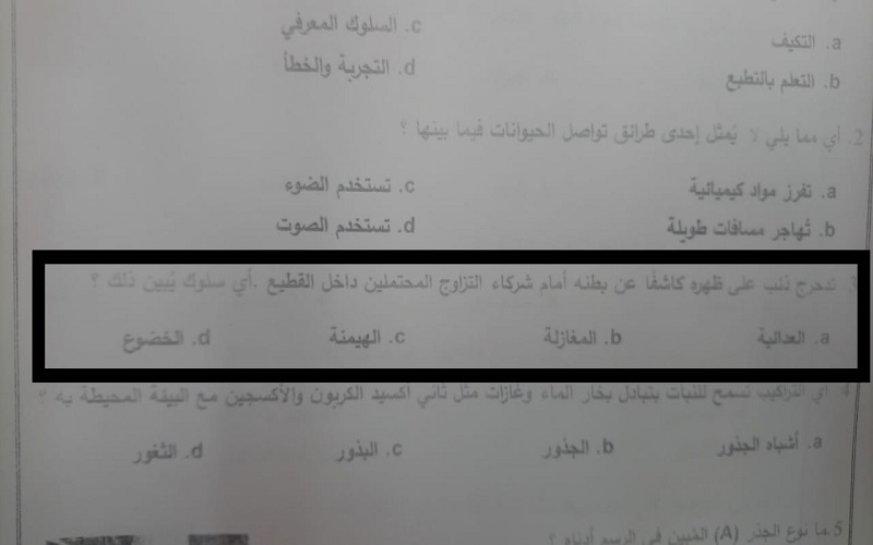 وكان نص السؤال في ورقة الامتحان "تدحرج ذئب على ظهره كاشفاً عن بطنه أمام شركاء التزاوج المحتملين داخل القطيع.. أي سلوك يبين ذلك ؟"، مطالباً الطلبة باختيار الإجابة الصحيحة من بين أربع إجابات هي (العدائية - المغازلة - الهيمنة - الخضوع).