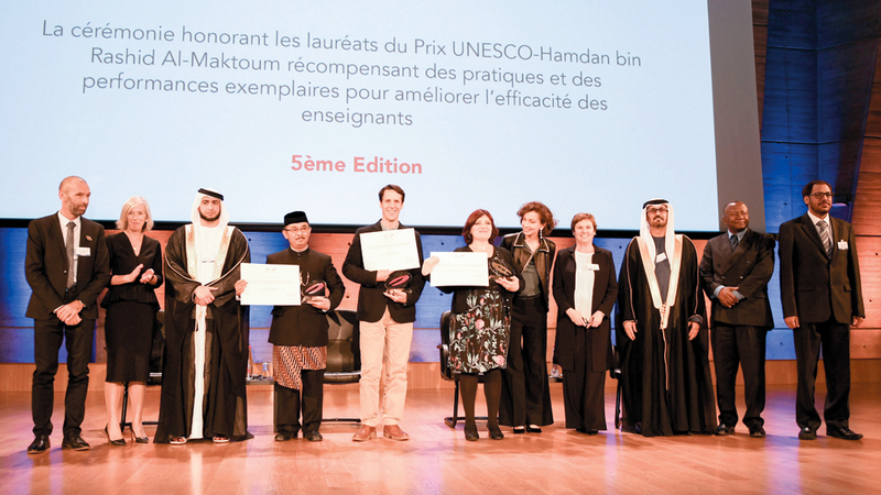 أناب سمو الشيخ حمدان بن راشد آل مكتوم، نائب حاكم دبي وزير المالية، الشيخ راشد بن حمدان بن راشد آل مكتوم، رئيس هيئة آل مكتوم للأعمال الخيرية والإنسانية، لتكريم الفائزين بجائزة حمدان بن راشد آل مكتوم للأداء التعليمي المتميز في دورتها الخامسة، خلال احتفال أقيم أمس، في مقر منظمة التربية والعلم والثقافة (اليونسكو) في العاصمة الفرنسية باريس. وأعلن خلاله عن إطلاق «المركز العالمي للمواهب»، أول منصة عالمية ذكية تتيح الفرصة لأصحاب المواهب العلمية والتقنية لإبراز طاقاتهم.
