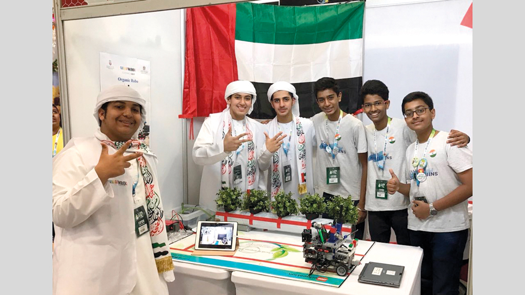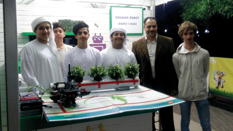 ابتكر ثلاثة طلبة مواطنين، عبدالله الهاشمي من مدرسة الغزالي، وعلي الحوسني من مدرسة خليفة بن زايد، وعبدالله بدر من مدرسة خليفة بن زايد، روبوتاً للزراعة العضوية، يدعم الزراعة من دون تربة، عبر استبدال التربة الطبيعية بأوساط نمو مائية. ويتولى الروبوت مراقبة الزرع وقياس مستوى ثاني أكسيد الكربون في الهواء، وإرسال تقارير دورية إلى مسؤول المزرعة، وأطلقوا عليه اسم «المُزارع الذكي»، لافتين إلى أن الروبوت به حساسات لتحديد الاتجاه، وقياس درجة حرارة الجو ونسب الغازات، بالإضافة إلى كاميرات تصوير حرارية، ويتم التحكم فيه واستقبال تقاريره عبر برنامج خاص تم تصميمه وتحميله على الكمبيوتر الشخصي.