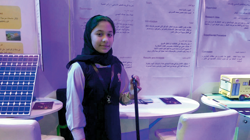 وقالت الطالبة شوق محمد الصريدي لـ«الإمارات اليوم»: عملت مع زميلتي العنود زكريا، تحت إشراف من معلمة العلوم في المدرسة، نعمة الحبسي، على ابتكار عصا مبرمجة ترسل موجات فوق صوتية تقيس المسافة بين الشخص الممسك بالعصا والعوائق التي أمامه، والتي من المحتمل أن يصطدم بها، ثم ترسل إشارات (اهتزازات) إلى يده أو تصدر صوت إنذار له حتى يتمكن من الابتعاد عن هذه العوائق، فلا يصطدم بها.