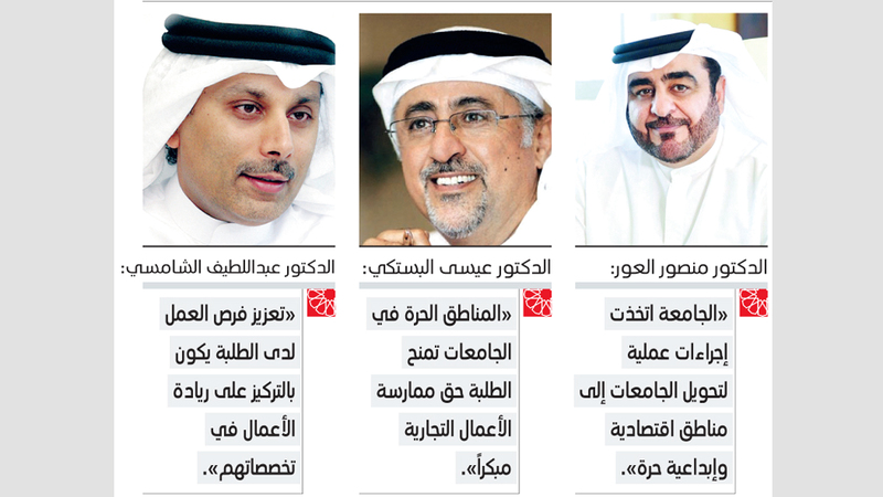 وتفصيلاً، قال رئيس جامعة حمدان بن محمد الذكية، الدكتور منصور العور، اتخذت الجامعة إجراءات عملية لتنفيذ البند السادس الذي يستهدف تحويل الجامعات لمناطق اقتصادية وإبداعية حرة، إذ وضعت الجامعة خطة عمل لتأسيس نادي للطلبة مختص بالأعمال والمشروعات، ومجلس لأصحاب الأعمال هدفه توجيه الطلبة إلى مكامن ومصادر الأعمال الناجحة، كخطوة في سبيل إنشاء شركة تابعة للمنطقة الحرة بالجامعة هدفها تنظيم وتطوير وتسويق وتدشين المنطقة الحرة في جامعة دبي، مشيراً إلى أن الجامعة اعتمدت منذ فترة ريادة الأعمال، من خلال الشراكة مع ثلاث شركات تتبنى تدريب وتأهيل الطلبة، كما تعتزم الجامعة في المرحلة المقبلة الشراكة مع شركتين أخريين في هذا المجال.