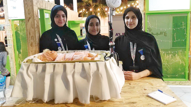 (من اليمين) هند وشما ومي خلال عرض الابتكار في «مبتكر 2019». من المصدر