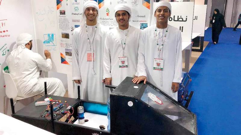 من اليمين: سالم وحامد وغانم خلال عرض ابتكارهم في أبوظبي. من المصدر